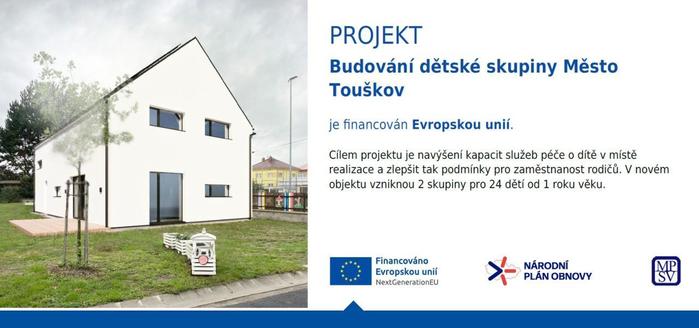 Město Touškov získalo finanční podporu z Národního plánu obnovy na vybudování objektu pro dětské skupiny. Objekt bude dvoupodlažní a bude sloužit pouze pro účely provozu služby dětských skupin. Realizací projektu dojde ke vzniku 2 dětských skupin o kapacitě 2x12, tedy celkem 24 dětí. Dotace připadající na výdaje bez DPH bude financována z Nástroje pro oživení a odolnost. Podíl připadající na DPH pak bude financován ze státního rozpočtu.